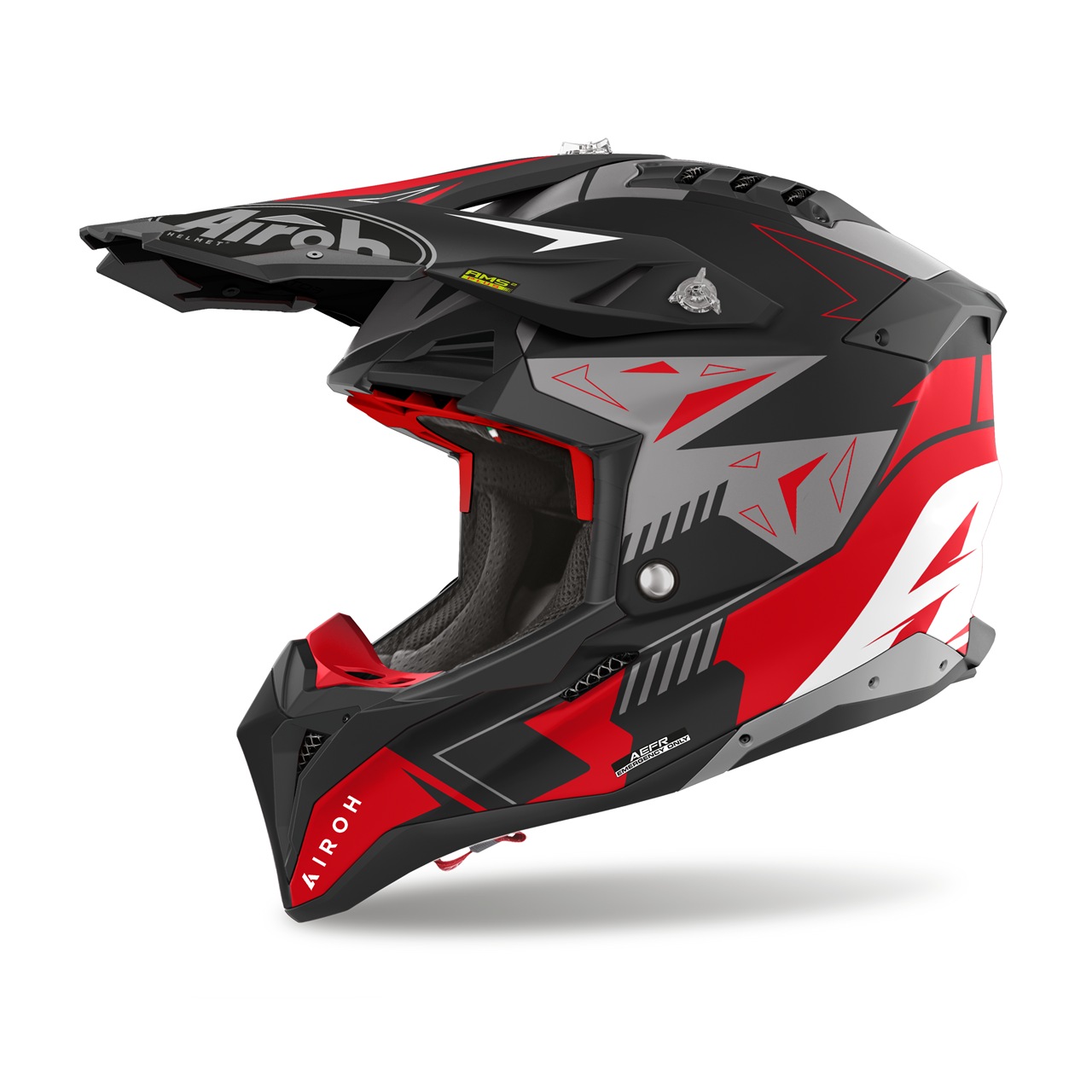 Capacete Airoh Aviator 3. Trata-se da ultima versão do mítico Aviator. O capacete offroad definitivo ficou ainda melhor. Airoh desenvolve o seu capacete de última geração e equipa o Aviator 3 com os mais recentes avanços tecnológicos. Caracteriza-se por incorporar o sistema de protecção AMS2 (Airoh Multiaction Safety System), o Sistema A.M.L.S (acolchoados interiores com fixação magnética) e possui o sistema A.E.F.R (Airoh Emergency Fast Remove). Atenção especial foi dada à aerodinâmica e tem um sistema de ventilação totalmente evoluído integrado ao design do capacete.