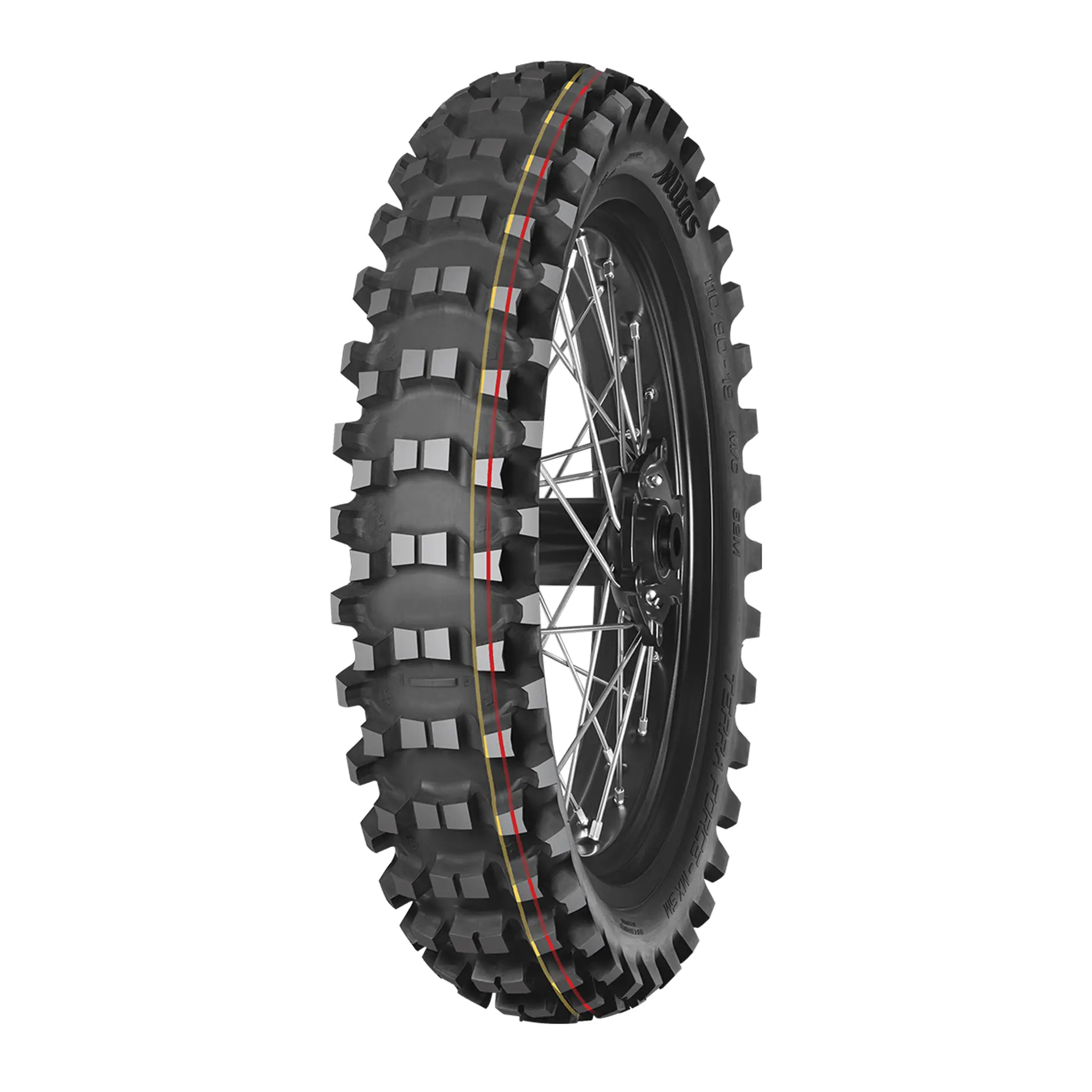 TERRENO MÉDIO E MACIO – Identificado pela característica faixa vermelha e amarela: Pneu de competição para motocross, fabricado com composto de borracha de dureza média para terrenos macios a médios.